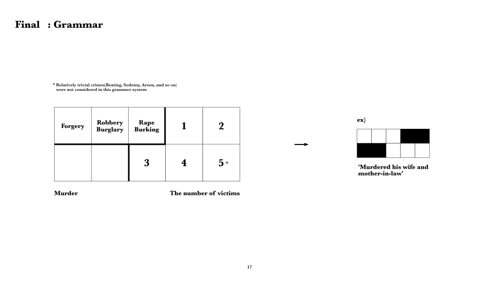 While I was making the relationship between the criminals and the victims to data, I thought that this data visualizing doesn’t show the information at once. Also, the interesting point was that regardless of the number of victims per crime issue, who they murdered or the types of crime, most of the criminals were executed. So I wanted to move on to look at the seriousness of the crime from this perspective. Because all these set was related to execution and crime.