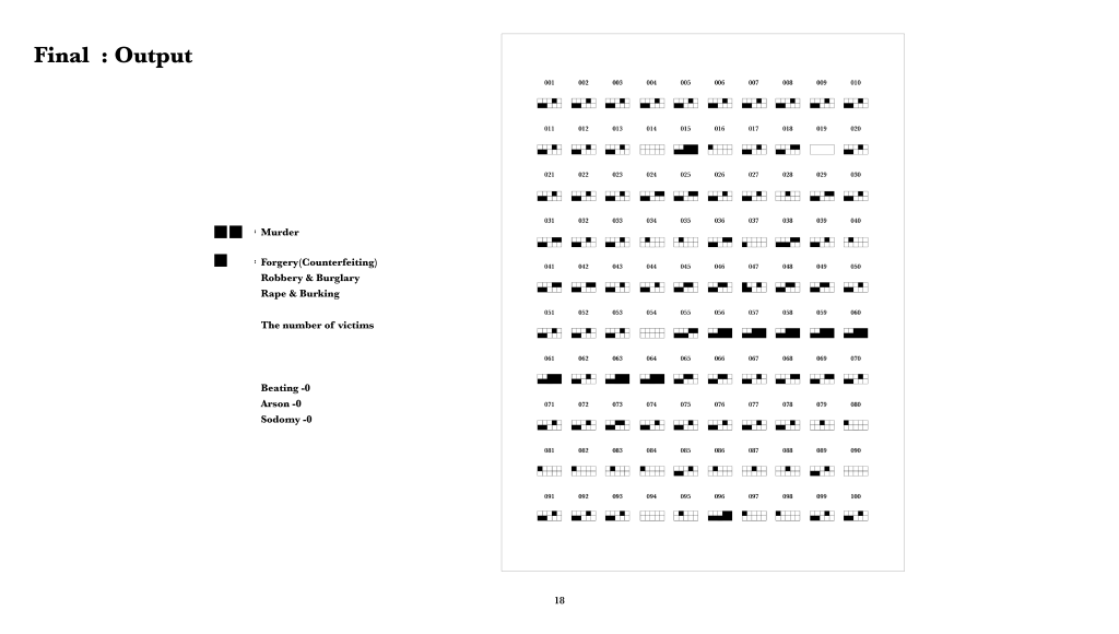 . My intention of the final units was to depict the different size and shape of the degree of the crime. However, it did not work well. I agree with the feedback that the final version of the outcome is not easy to read data at once. I would like to try both of the final version and previous version to develop.