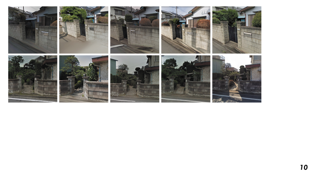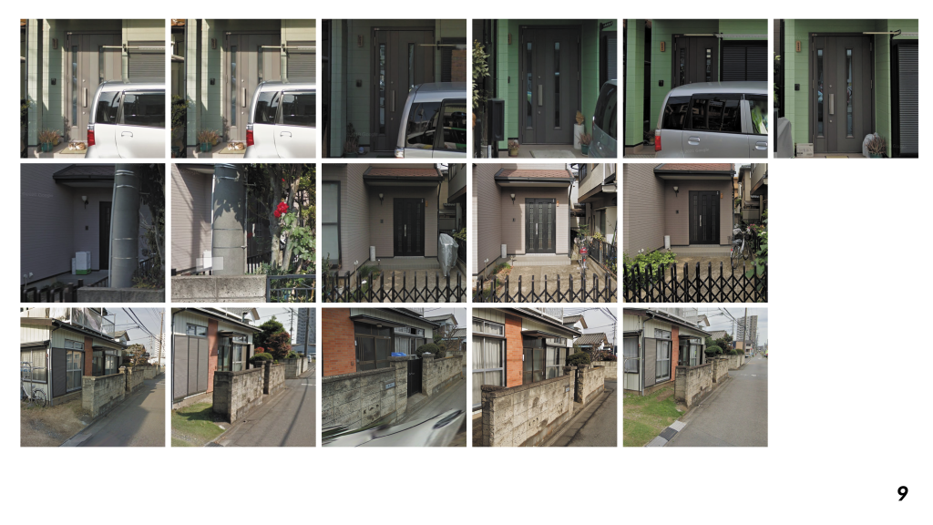 01-02) While I’m doing the virtual travel, I found that it’s really easy to look around the residential areas and private gardens in front of their houses. This finding leads me to the question ‘Does personal privacy is protected if you erase the faces on Google Street View?’ In fact, while producing Street View, personal information on Wifi networks was collected without permission. Whenever that happens, Google mentioned that it was ‘unintentional mistakes’ or ‘There wasn’t any other intentions or purposes.’ From this idea, I imagined what if someone continuously checks my residential area over a few years like stalkers? So I captured doors on the Street View to make it as a perspective of stalkers.