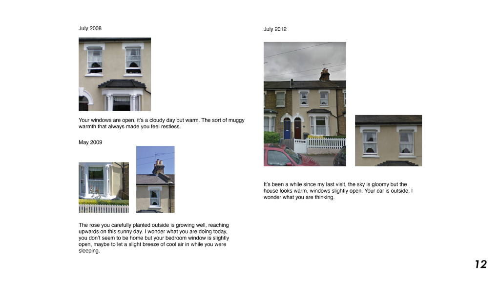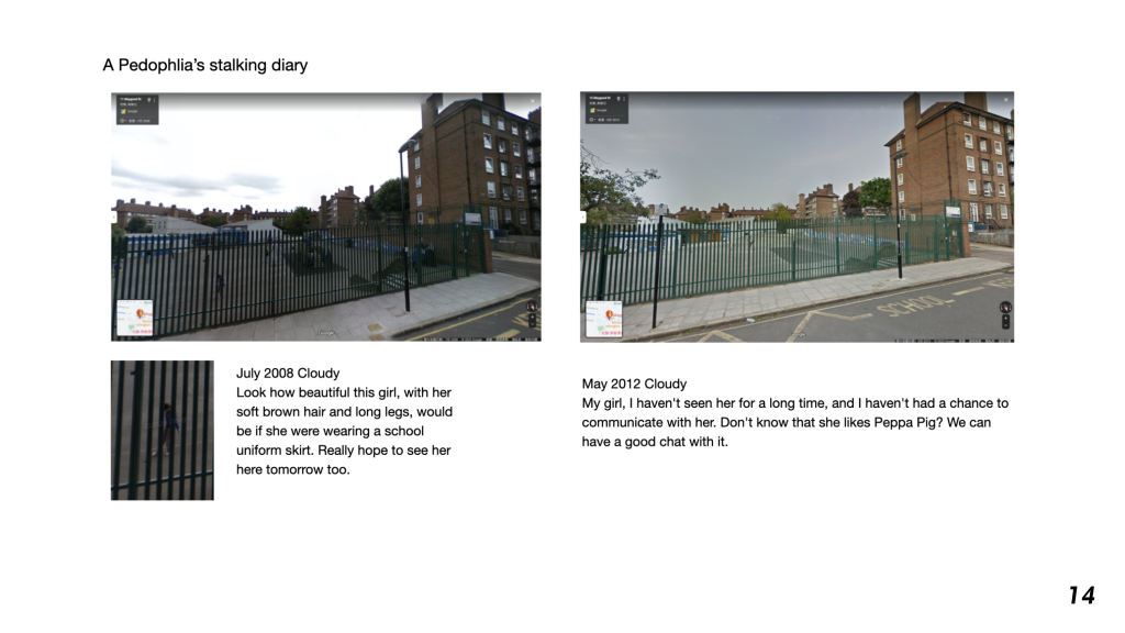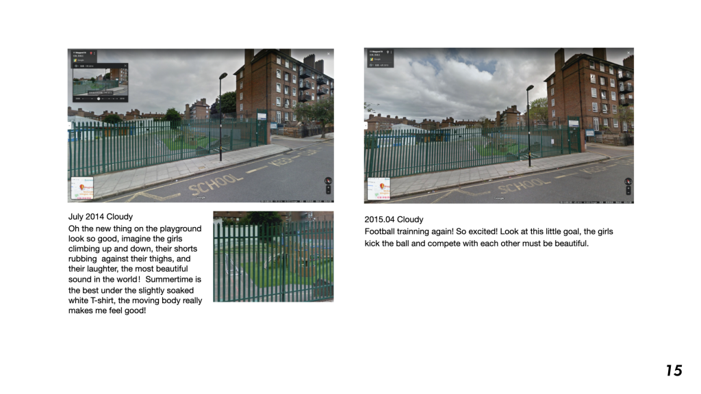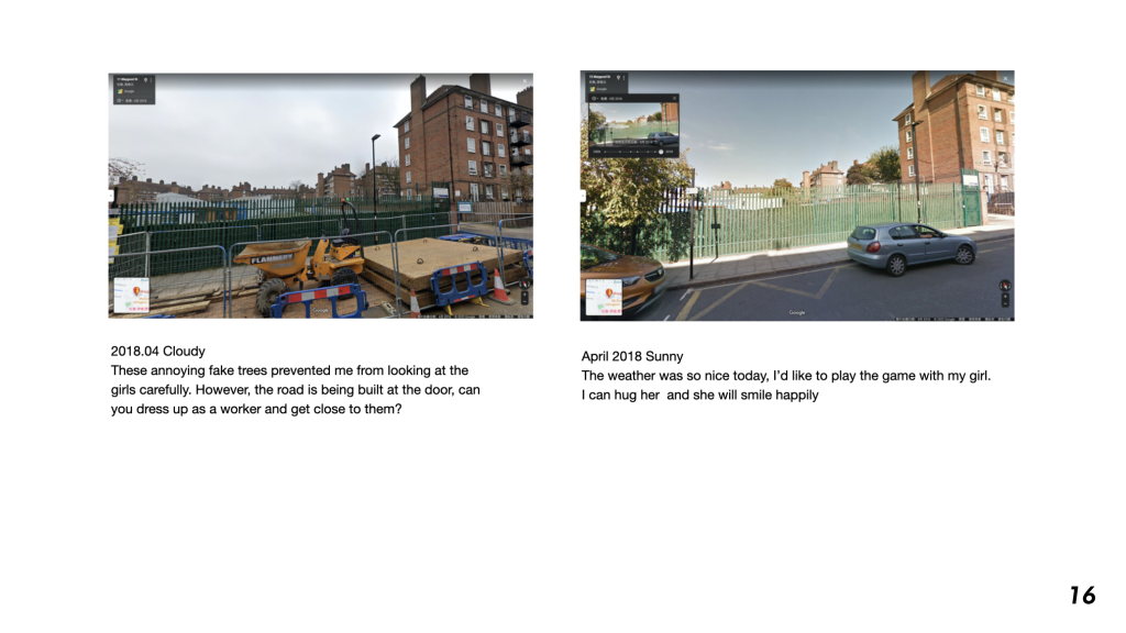 01-03) Stalker’s diary: Following the previous first draft, our group made a stalker’s diary by using images on Street View.