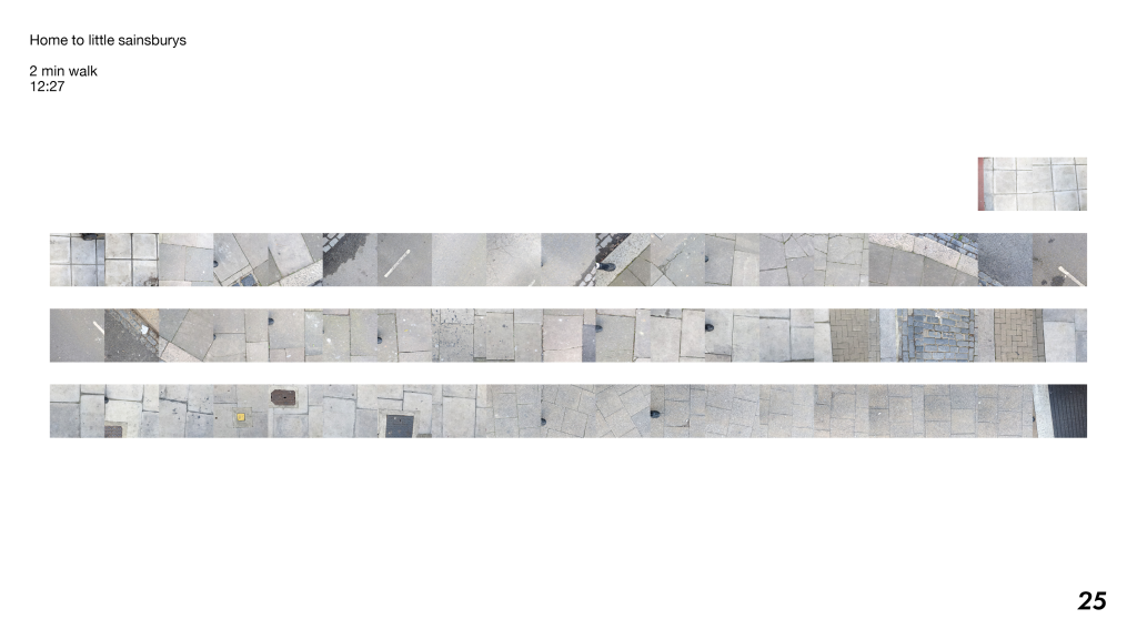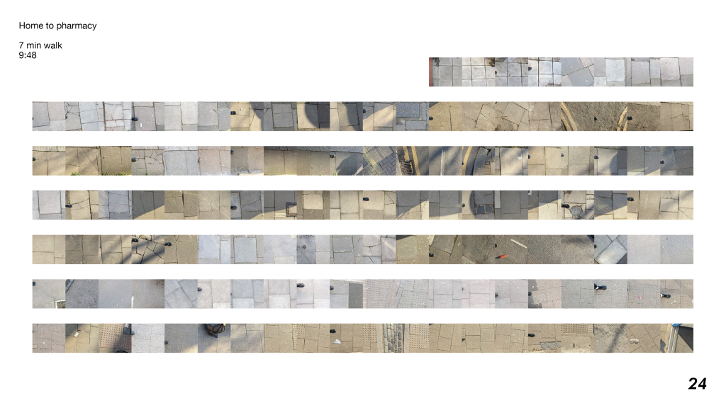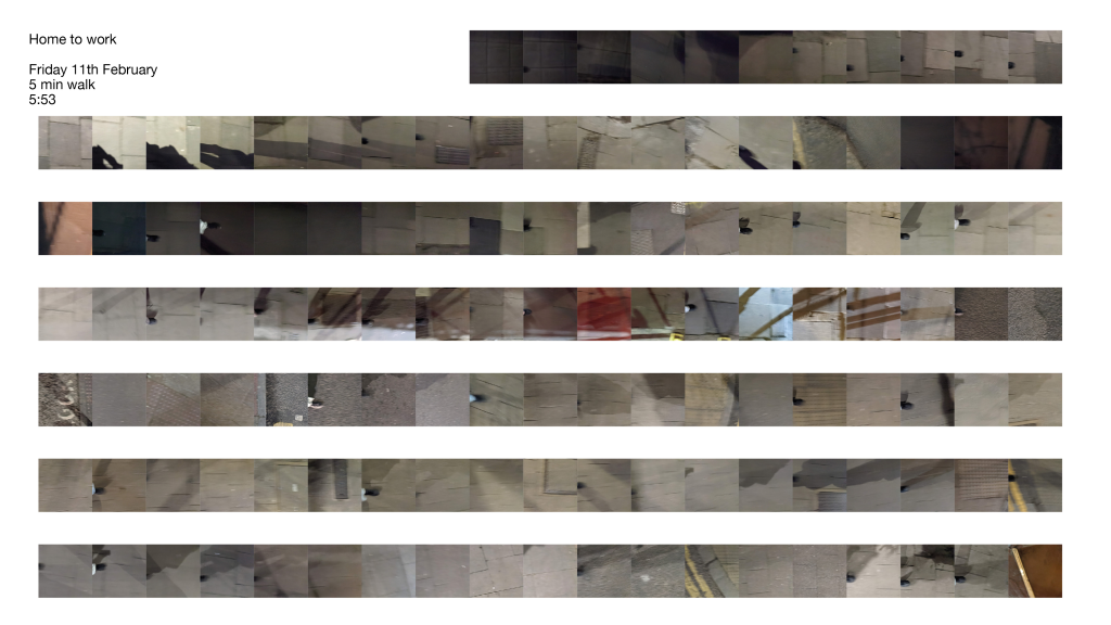 Since Google Street View is capturing images at our eye level, lots of images of pavement(ground) are automatically generated. Motivated by this fact, we had an experiment to capture the ‘street view’ in daily life.