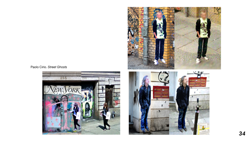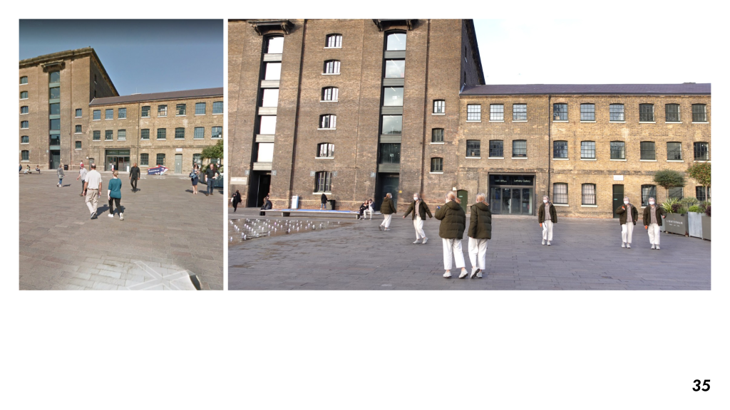 Street Ghosts by Paolo Cirio is the project to bring the images on Street View to reality. He finds the images of people on Street View and prints them in real size. By adding the real-sized images of people in the same space just as on Google Street View, he brought the images to reality. Referencing this project, we captured on scene on the Street View and made new image on that space by mimicking their pose and position.