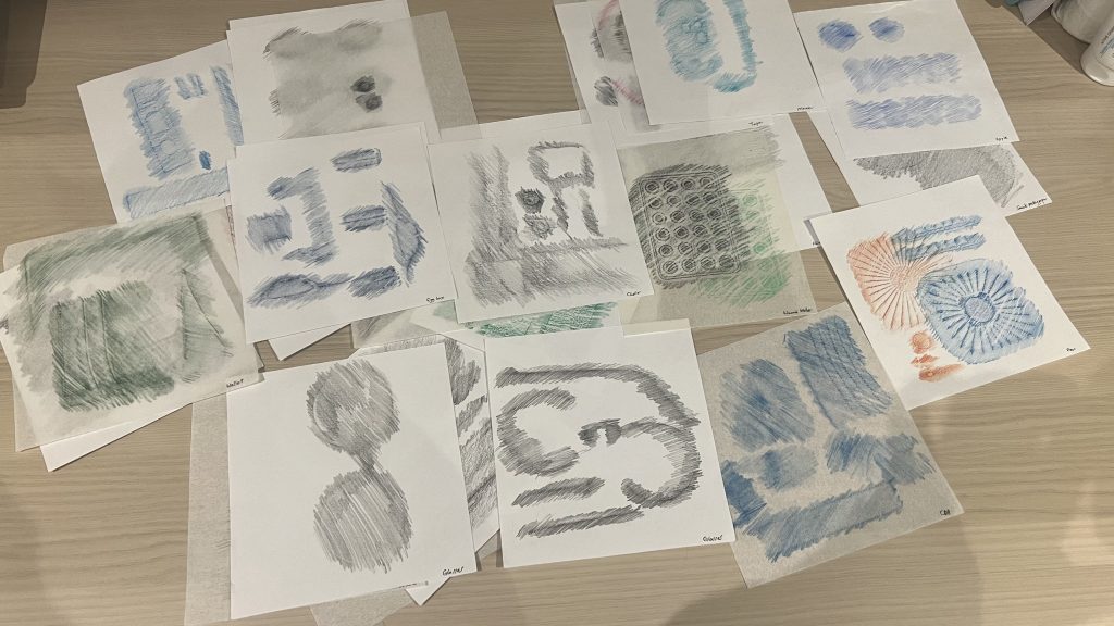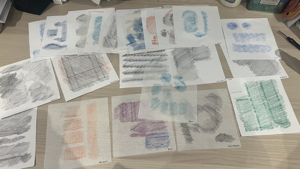 For the second iteration process, I decided to bring the ‘unwrapping’ concept into real life and give them materiality. Among several ways to unwrap the objects, I decided to frottage the daily objects. Fundamentally, it’s not ‘unwrapping’ the objects. However, ‘UV unwrapping’ function that I used in the previous stage was more like peeling out the surface of the objects and I thought doing frottage is similar to this process.