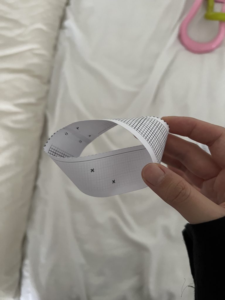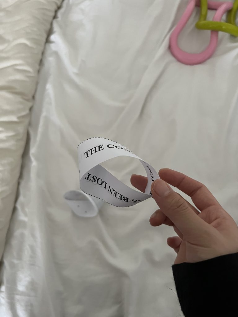 Also, continuing the dualistic mechanism, I considered how to visualize this invisible mechanism and system behind the screen. Finally, I made two types of Mobius strips. For the first version, I wrote down ‘The location point has been found.’ on one side of the paper and ‘The connection has been lost.’ on the other side. And by connecting the edges with twisting, I made them into the shape of a Mobius strip. So people could read two sentences again and again if they follow the sentences. For the other version, I draw a grid that has lost some spots on one side of the paper and marked the same spot without drawing the grid on the other side. So this time, people could see the lost point on the grid and the mark(found point) repeatedly if they follow the strip.