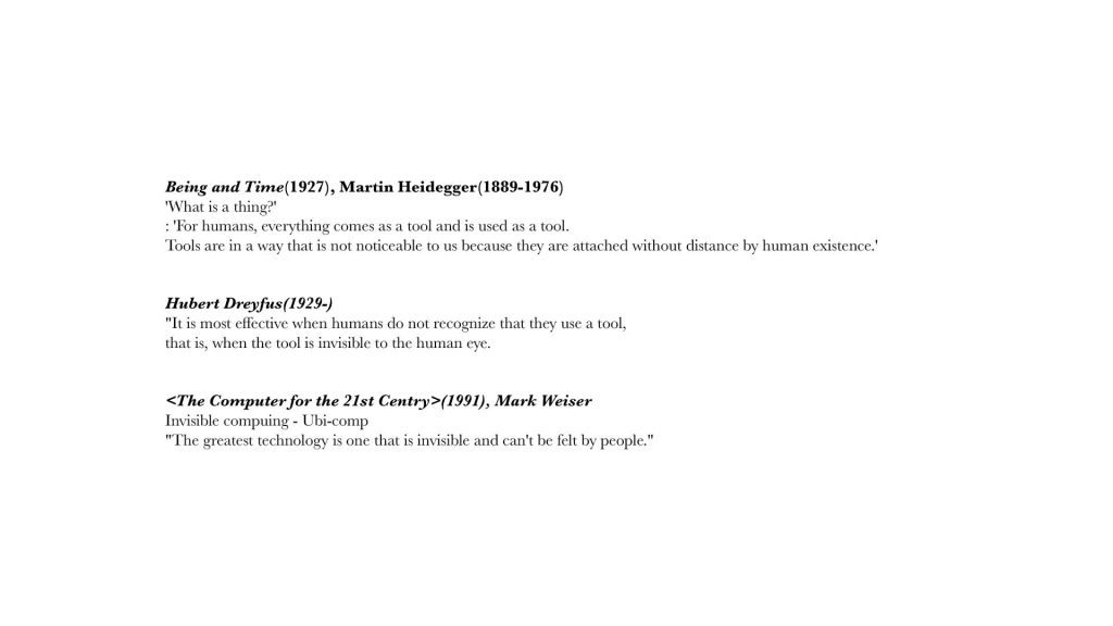 - Martin Heidegger, a German philosopher, asked the question “What is the equipment(thing)?” in his writing <Being and Time>(1927) to understand the human being, ultimately. “Tools are in a way that is not noticeable to us because they are attached without distance by human existence.”