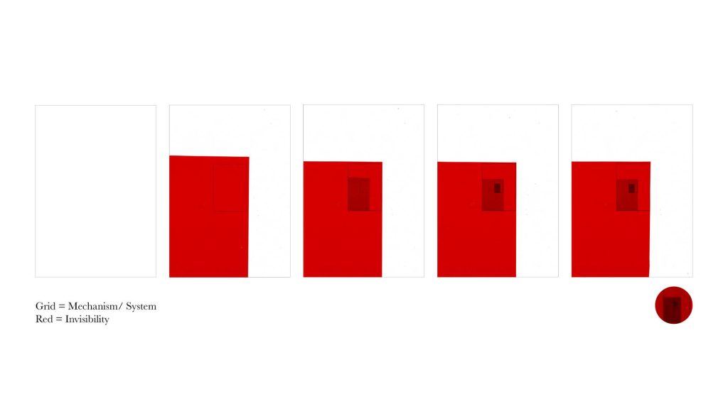 Focusing on invisibility/seamlessness/immediacy, I draw a red grid on the paper and made them invisible by putting a red film on it. After scanning this, I printed the scanned image and draw a red grid on it. And then put a red film on it and scanned it again. By repeating this process, I tried to move back and forth between invisibility and visibility.